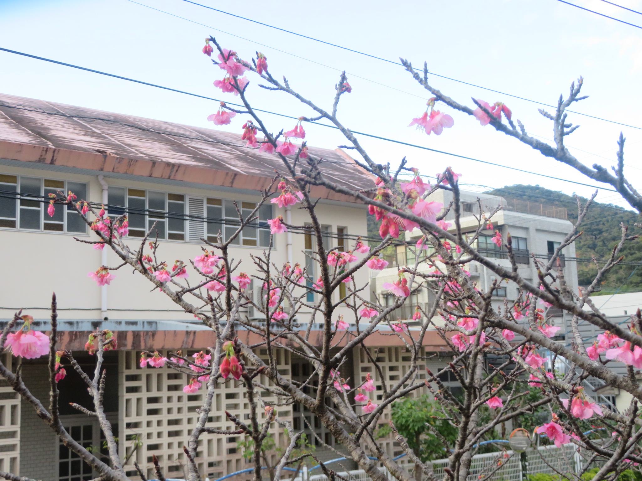 幼稚園の園庭の緋寒桜は、名瀬測候所の標本木となっており、この季節になると職員の方が観測に来られます。