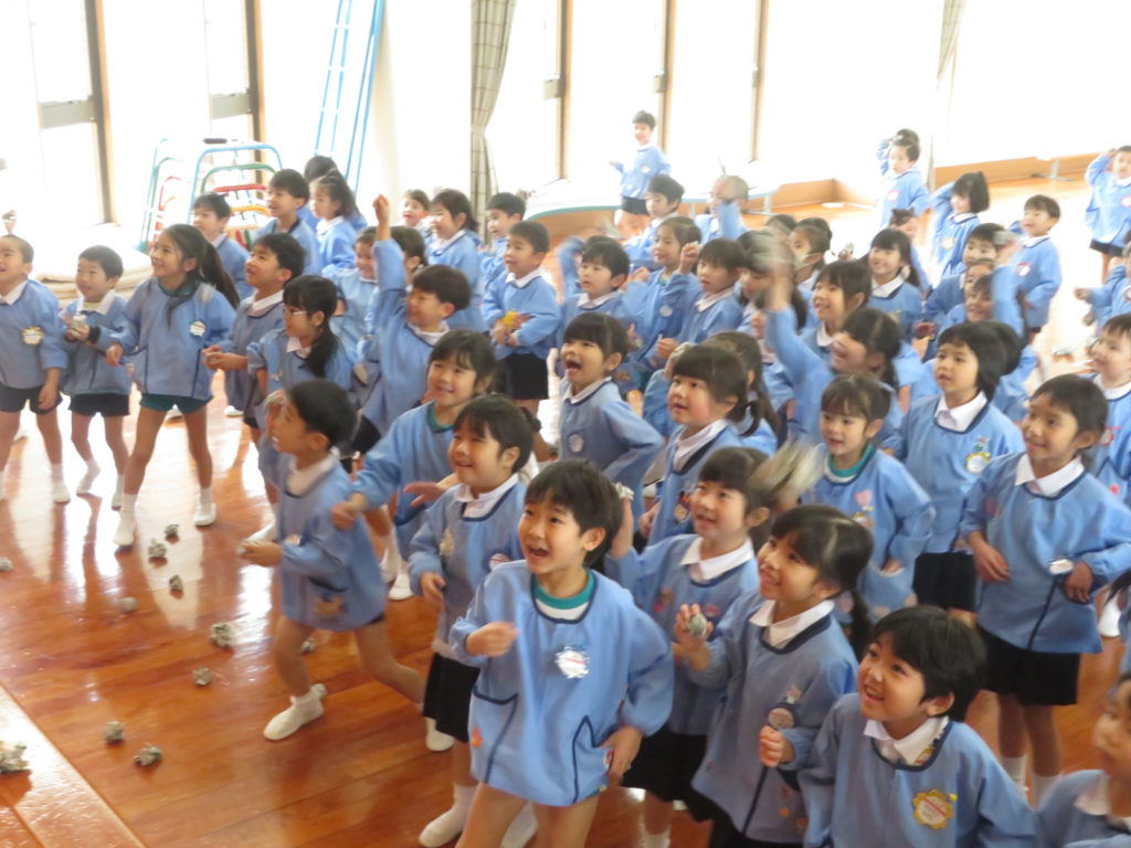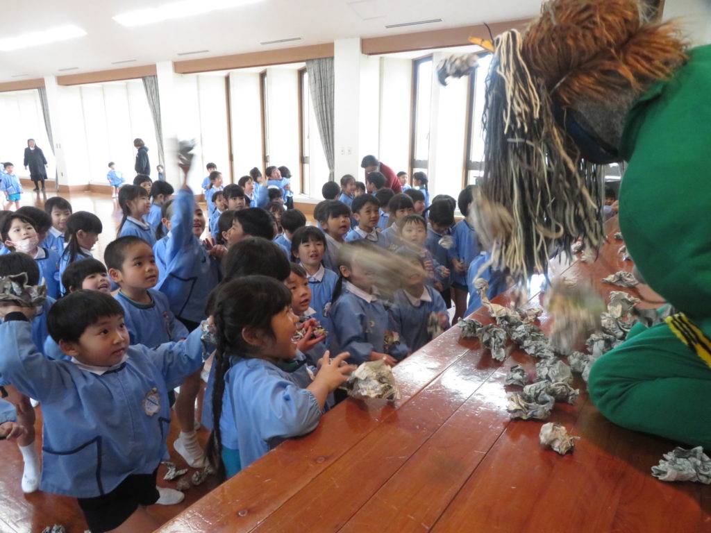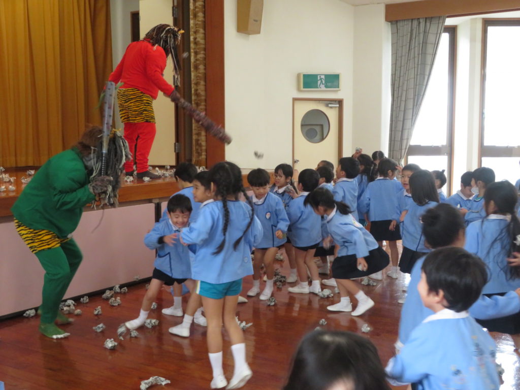 一方、ちっとも怖くない様子の子ども達は、掛け声と共に新聞豆を力いっぱいまいていました。