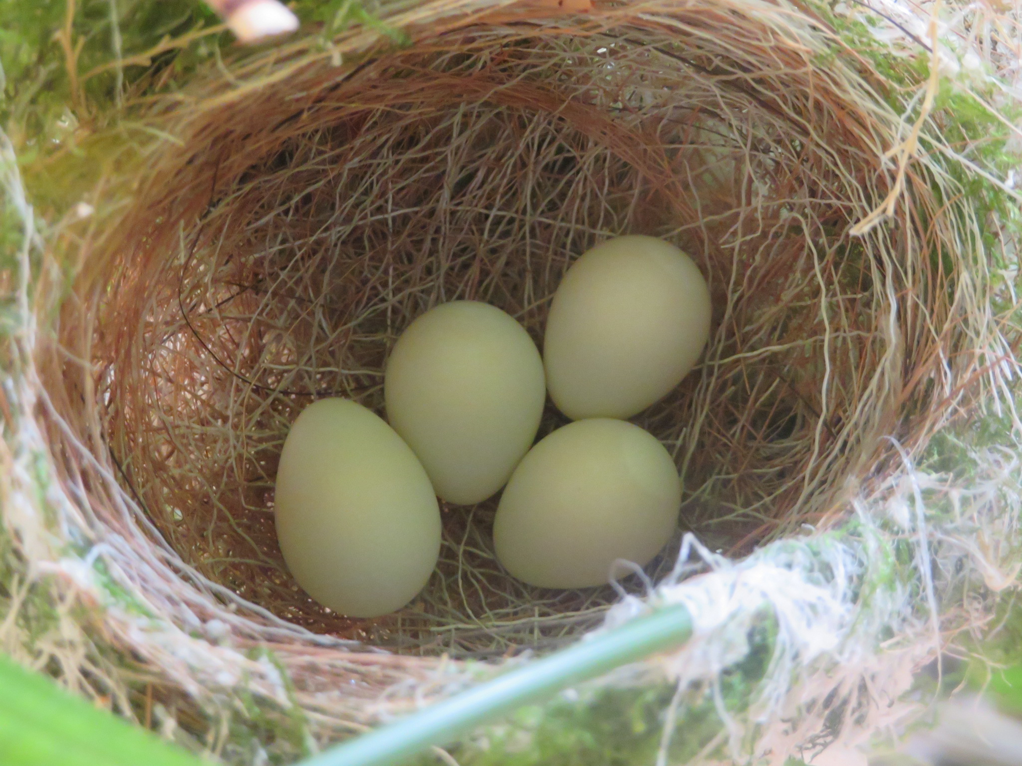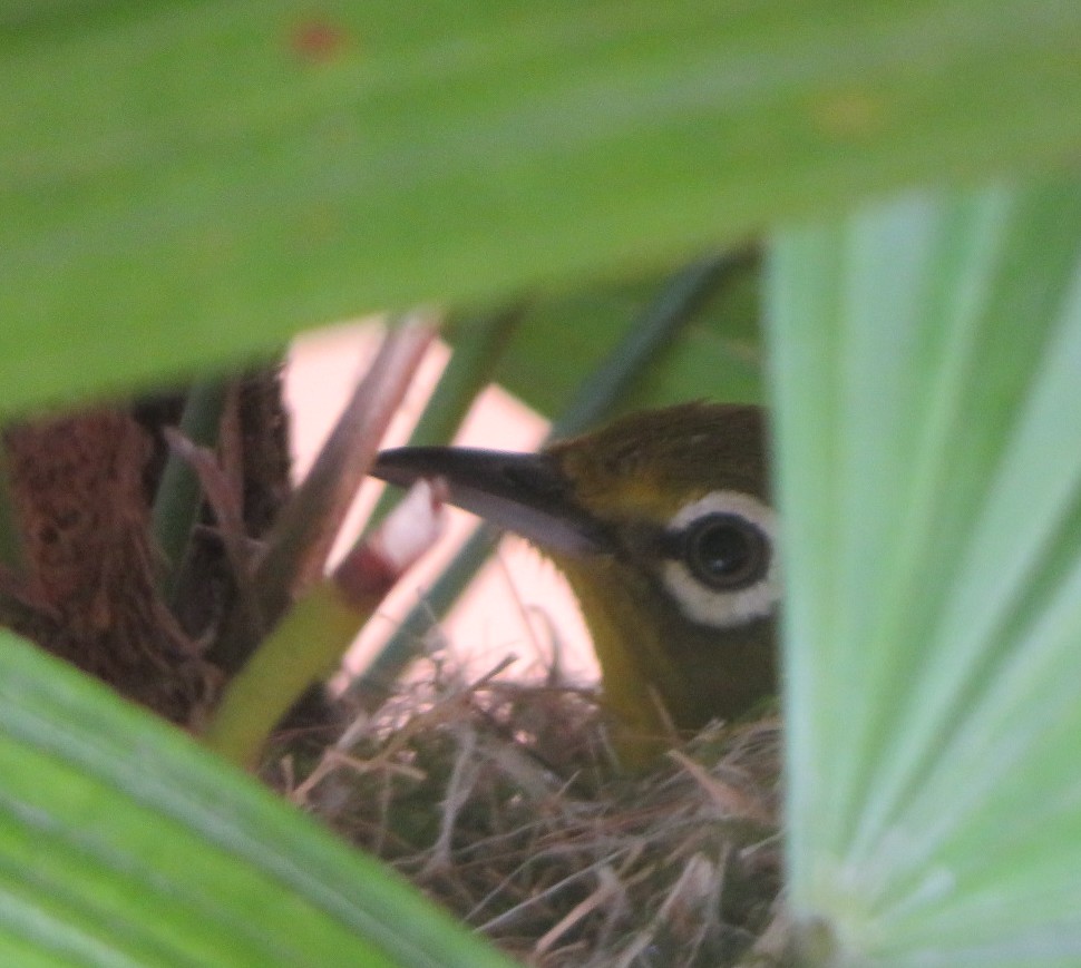 2階テラスの植木の中でメジロが巣作りをして産卵、母鳥がお世話をしています。