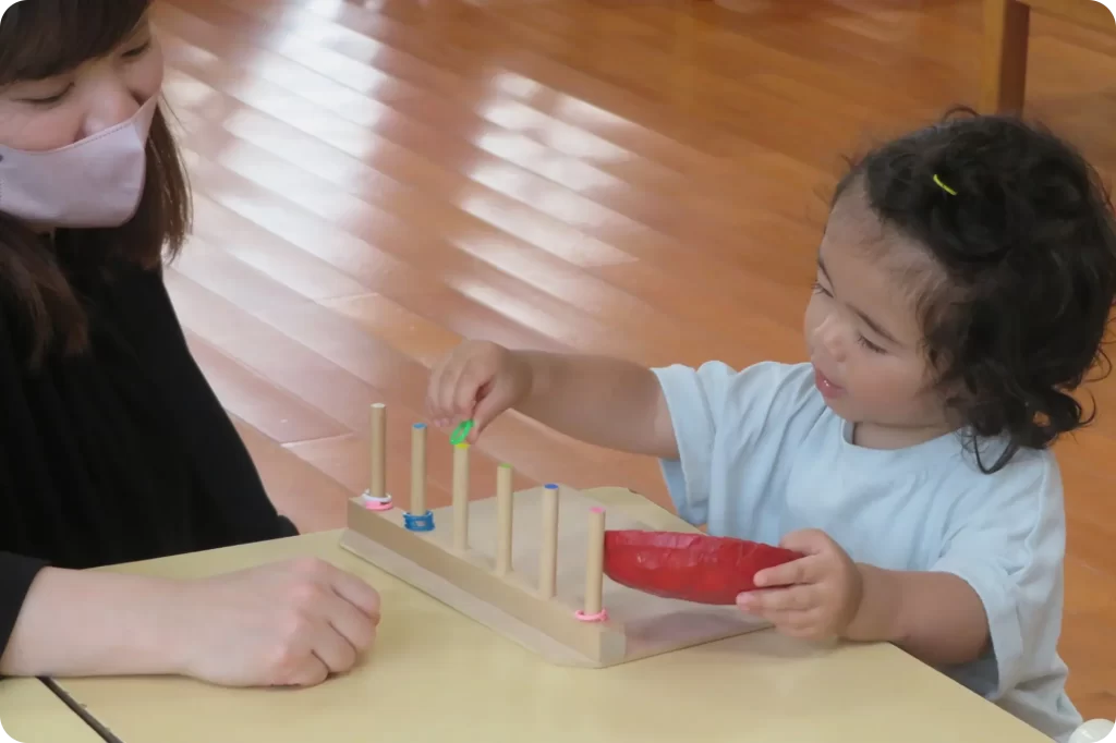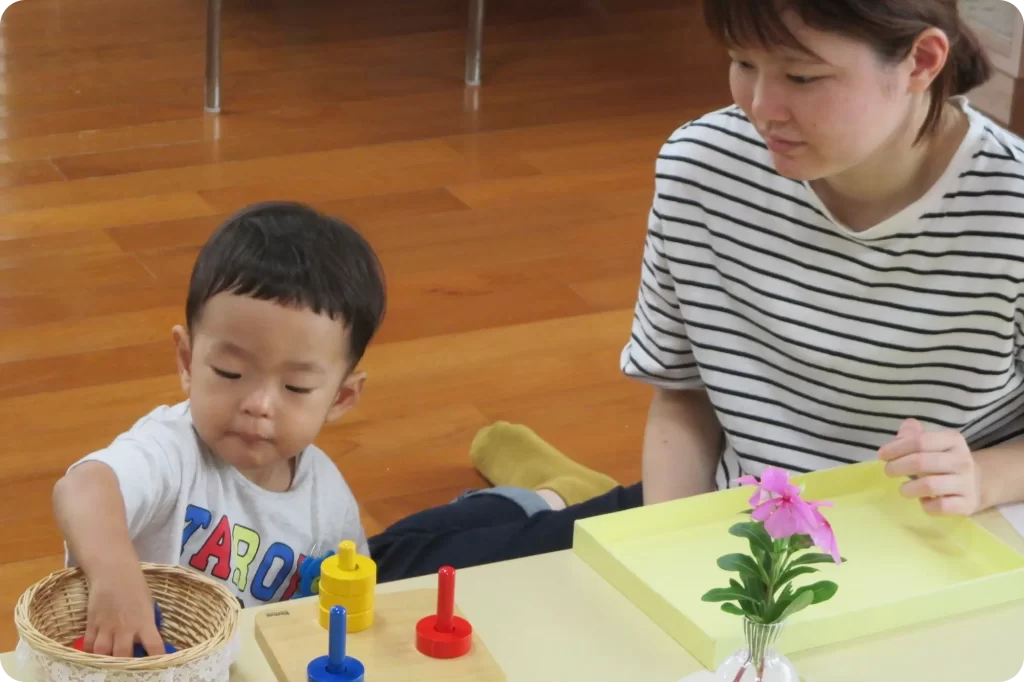 - 園庭では、魅力ある遊具で遊び、教室では、幼児の発達に適した沢山の教具を使い、広いホールでは、優しい先生たちと一緒に、